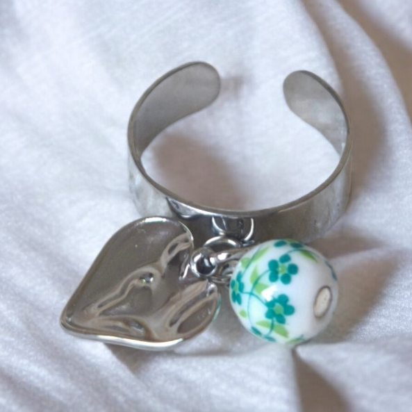Chaque bague est ornée de pampilles en acier inoxydable et/ou de perles céramiques, qui ajoutent un mouvement subtil et une texture naturelle à la composition.