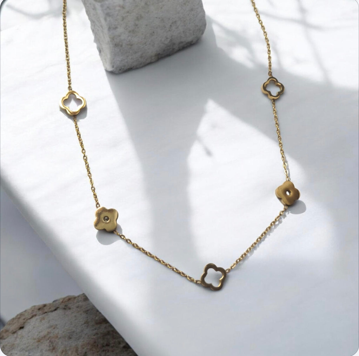 Délicat et intemporel, le collier Solenn séduit par son design floral raffiné. Sa chaîne en acier inoxydable est ponctuée d’une alternance harmonieuse de fleurs creuses et pleines, créant un jeu de lumière subtil et élégant autour du cou.